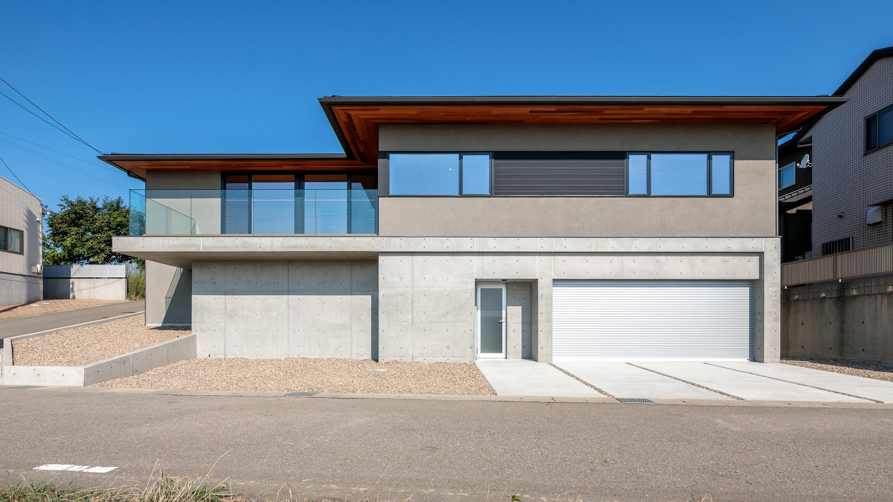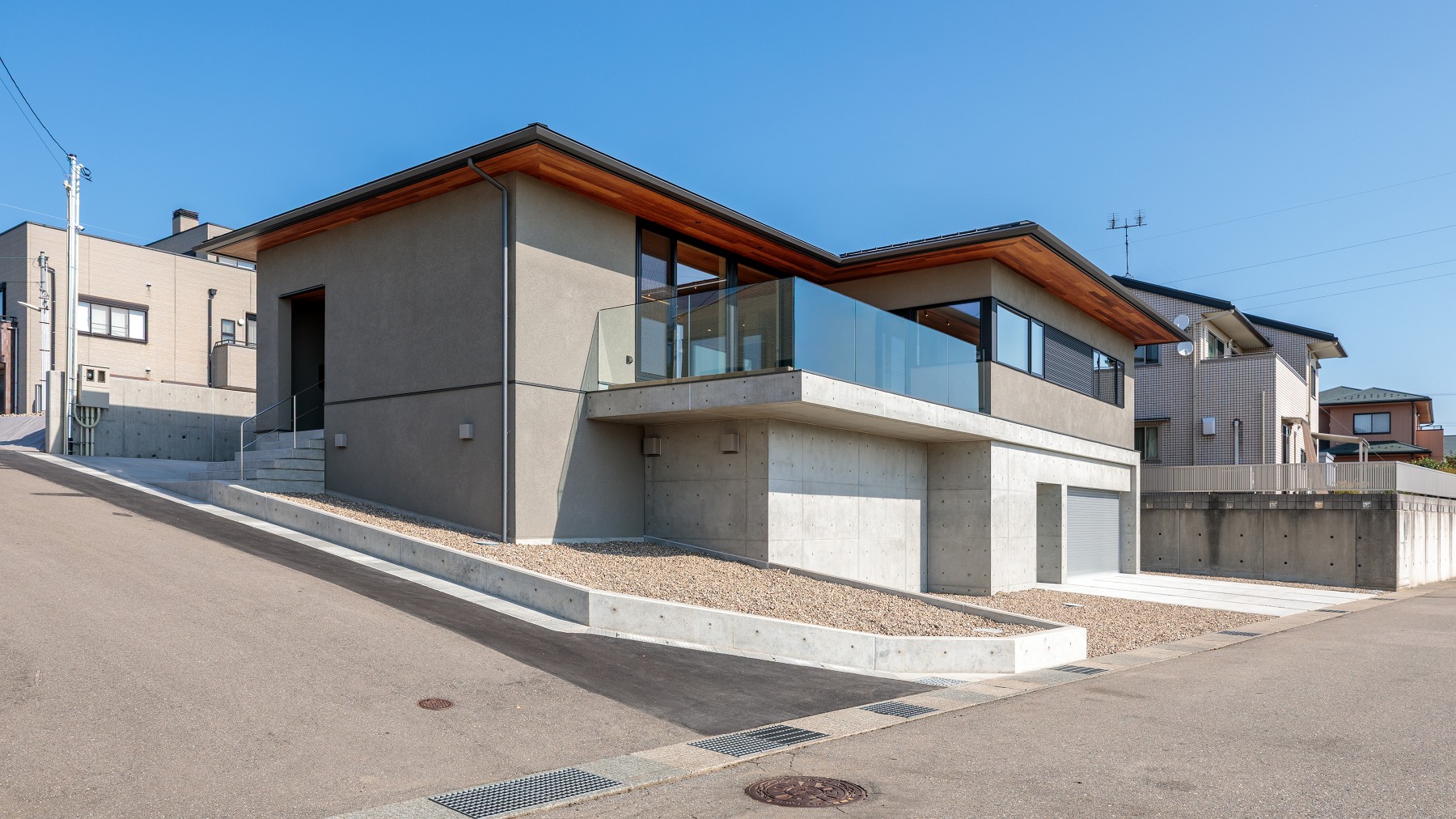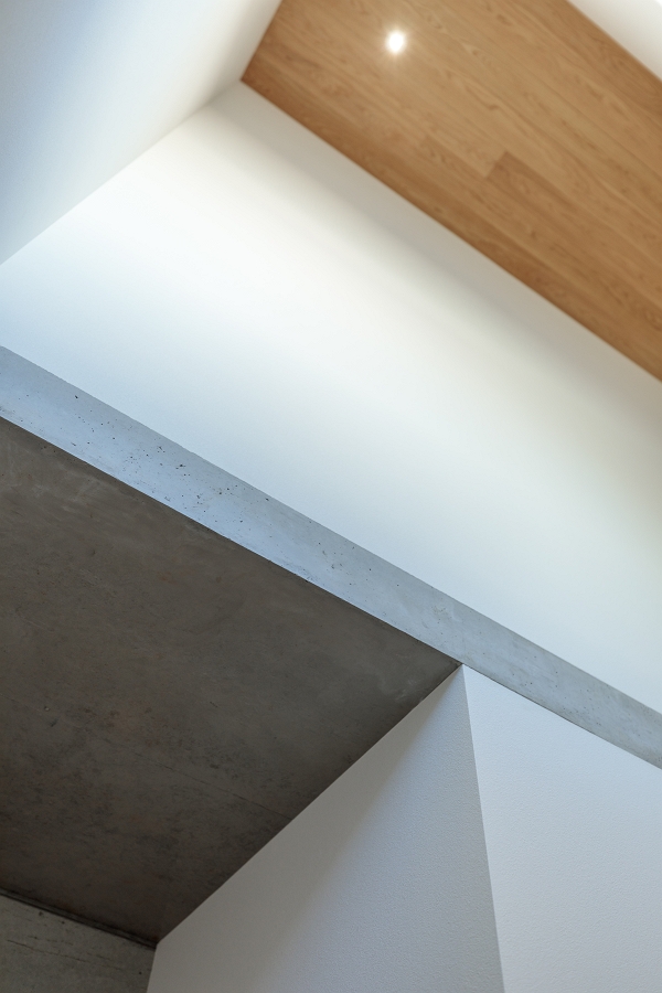 ドラムを叩ける防音室やビルトインガレージ、伸びやかで眺望のいいリビングとルーフテラス、急傾斜地などの条件から、鉄筋コンクリートと木造の混構造を採用した “盛りだくさん”な家