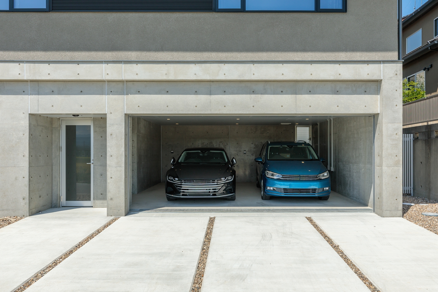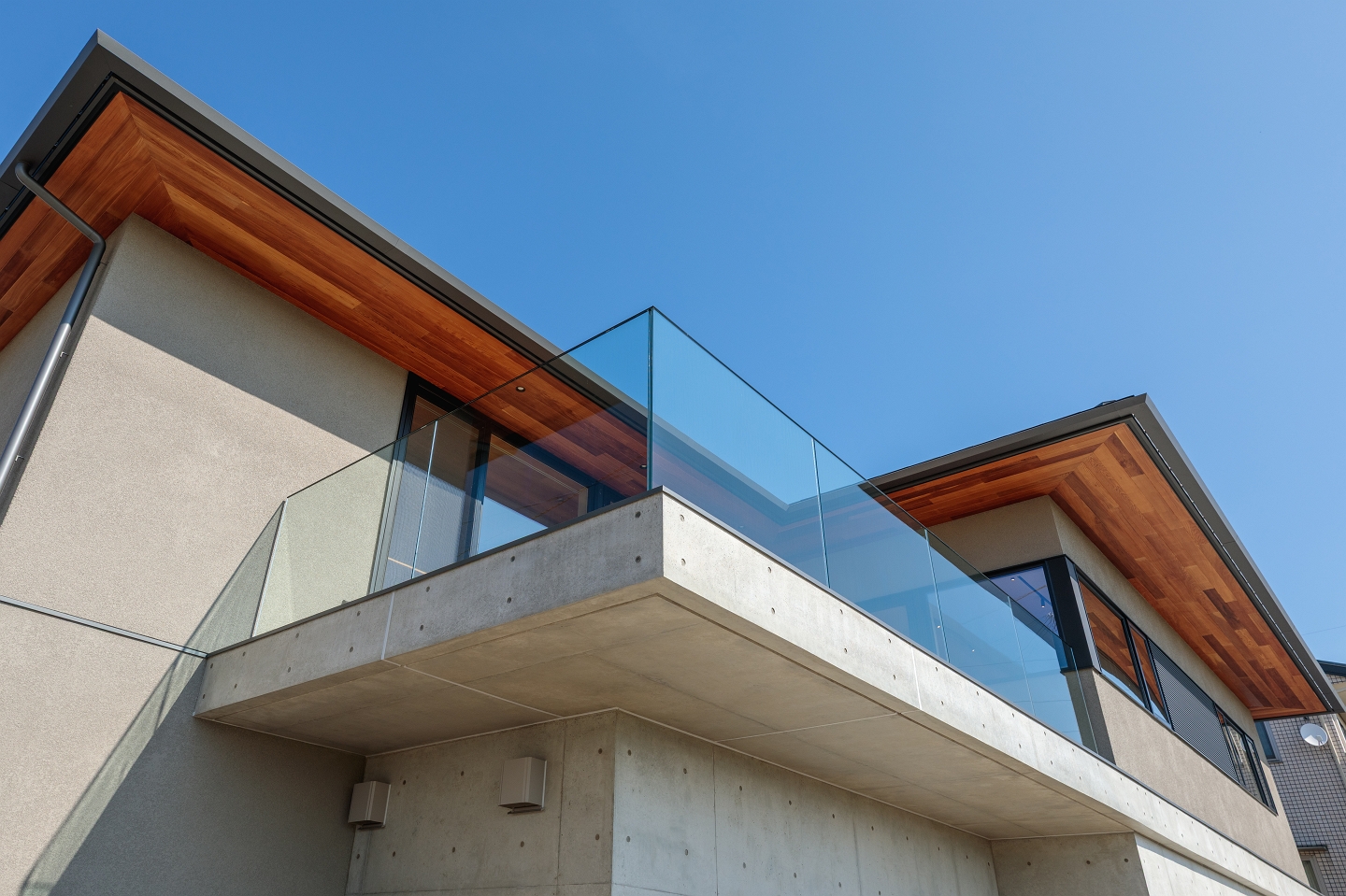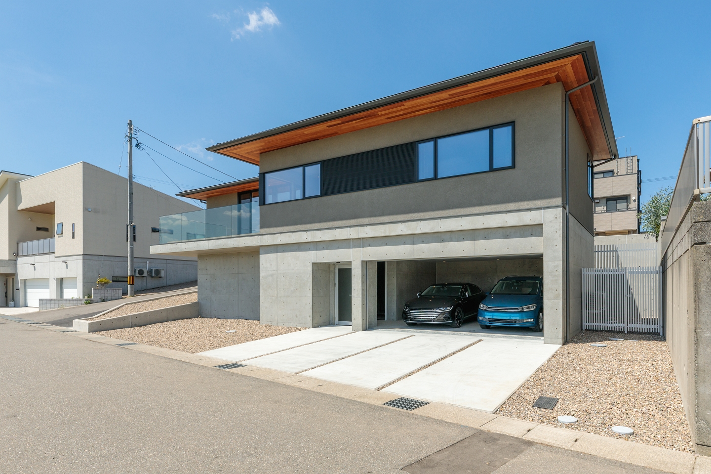 ドラムを叩ける防音室やビルトインガレージ、伸びやかで眺望のいいリビングとルーフテラス、急傾斜地などの条件から、鉄筋コンクリートと木造の混構造を採用した “盛りだくさん”な家